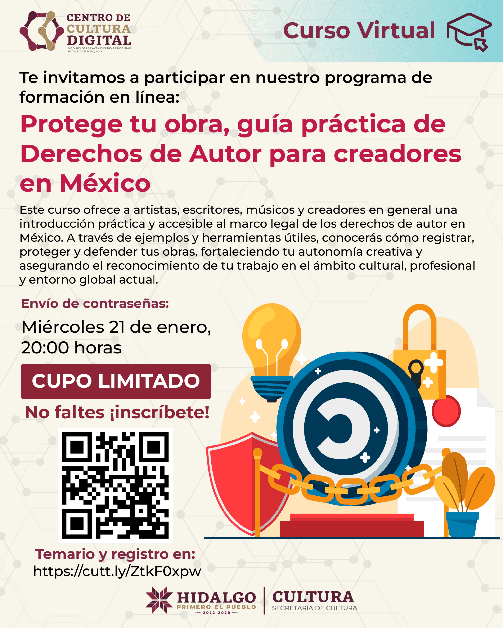 - Página informativa: https://ccd.culturahidalgo.gob.mx/evento/curso-en-linea-protege-tu-obra-guia-practica-de-derechos-de-autor-para-creadores-en-mexico/